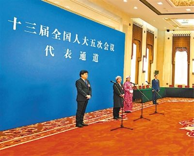 3月5日,十三届全国人大五次会议举行首场“代表通道”采访活动。图为代表们接受采访。
