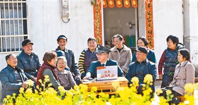3月8日,安徽省马鞍山市博望区工作人员向西城村村民介绍政府工作报告中有关推进乡村振兴的举措。